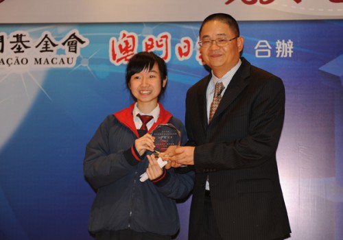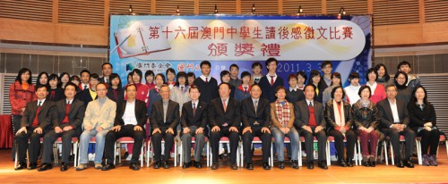 頒奬禮昨日下午六時在澳門科學館會議廳舉行。吳志良,本報副總編輯廖子馨,澳門基金會行政委員區榮智,本報副刋課主任湯梅笑,高中組評判陳業東、陳志峰、鄧曉炯,初中組評判趙陽、李公榮、郭濟修,多家獲奬學校負責人以及導師出席。是屆共收到了三百一十份參賽作品,較上屆熱烈。