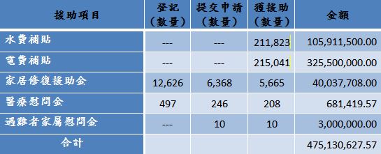 水電補貼:2017年10月起經自來水公司向受停水影響的住宅用戶共211,823個單位提供水費補助各500元,經澳電向受停電影響的住宅用戶共215,041個單位提供電費補助各1,500元,共逾4.3億元。