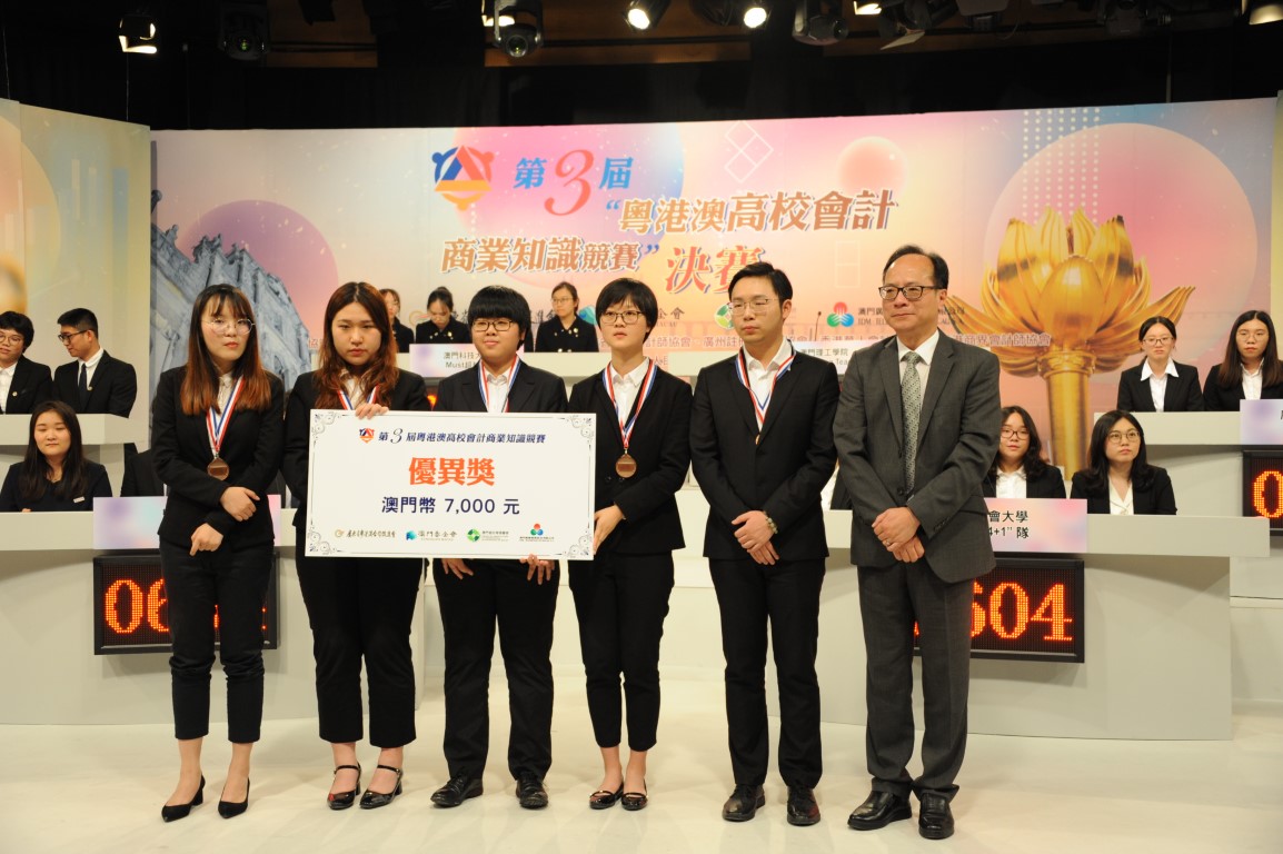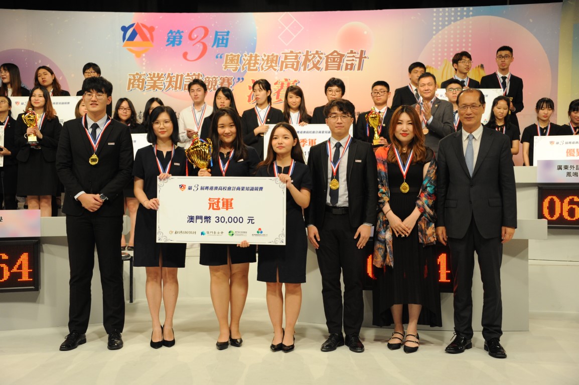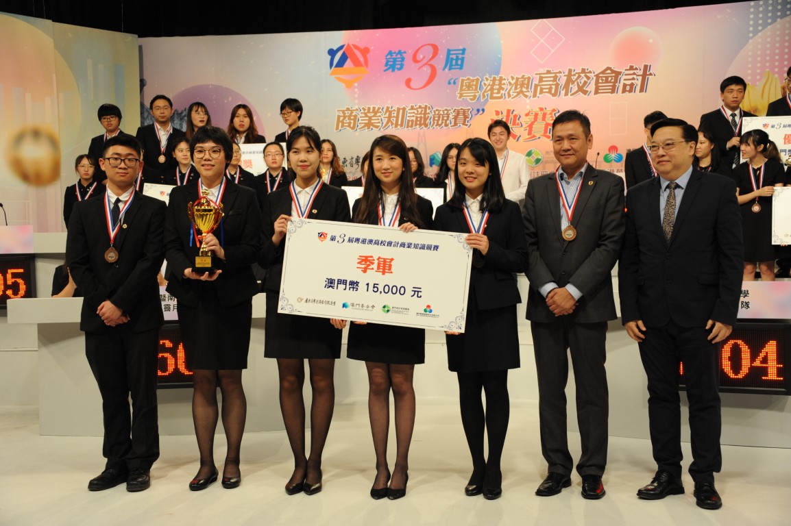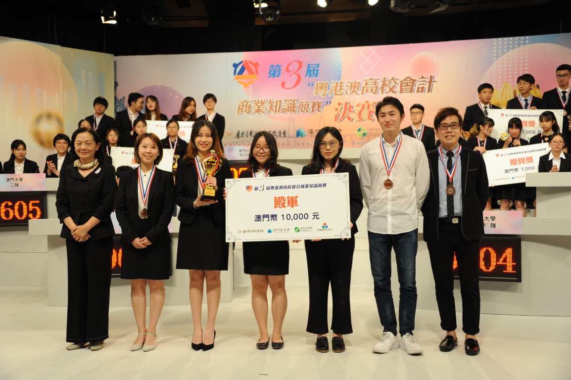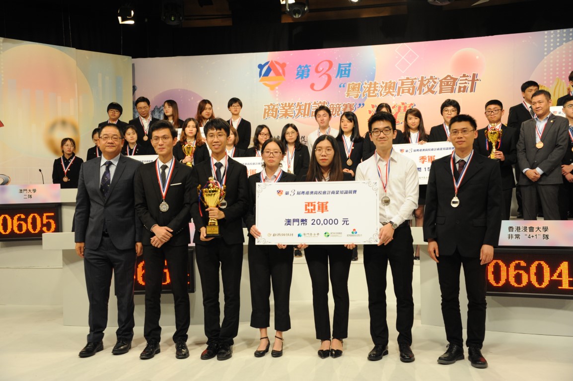 由廣東省粵港澳合作促進會、澳門基金會、澳門會計專業聯會、澳門廣播電視股份有限公司聯合主辦,廣東省人民政府港澳事務辦公室為指導單位“第三屆粵港澳高校會計商業知識競賽”已於5月24日(今天)在澳門綜藝二館完滿舉行。來自粵港澳三地8間大專院校共8支賽隊競逐,最終由暨南大學霽月隊奪得本屆競賽冠軍,廣東外語外貿大學鳳鳴嶺南隊獲亞軍,澳門大學二隊獲季軍,香港浸會大學非常“4+1”隊獲殿軍,澳門科技大學Must超越隊、澳門理工學院MPI Accounting Team 1隊、中山大學Bonus Receivable隊及香港中文大學匿名隊獲優異獎,個人最佳表現獎則由來自廣東外語外貿大學鳳鳴嶺南隊的盧浩倫奪得。