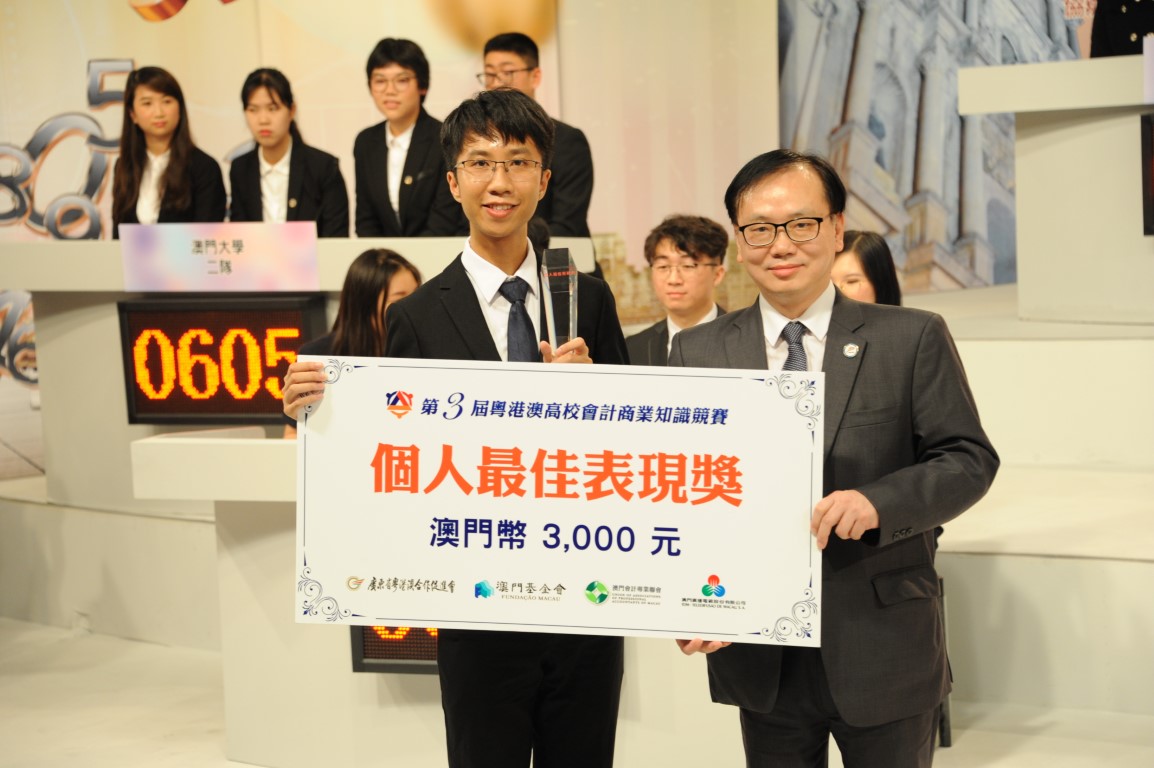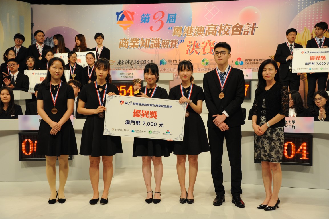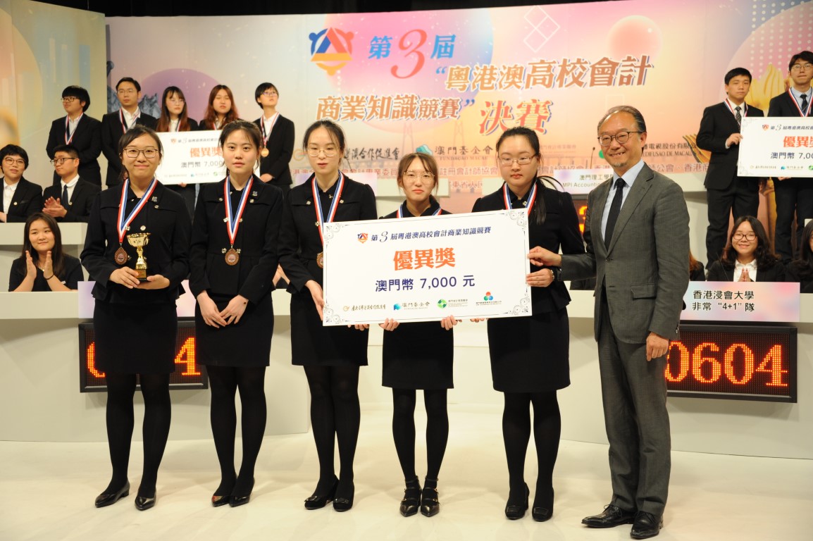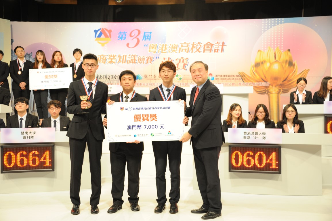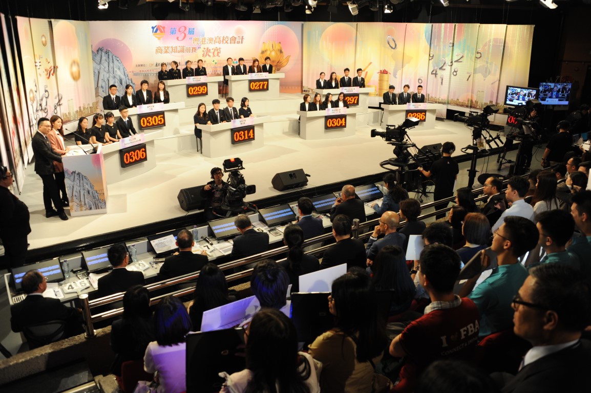 由廣東省粵港澳合作促進會、澳門基金會、澳門會計專業聯會、澳門廣播電視股份有限公司聯合主辦,廣東省人民政府港澳事務辦公室為指導單位“第三屆粵港澳高校會計商業知識競賽”已於5月24日(今天)在澳門綜藝二館完滿舉行。來自粵港澳三地8間大專院校共8支賽隊競逐,最終由暨南大學霽月隊奪得本屆競賽冠軍,廣東外語外貿大學鳳鳴嶺南隊獲亞軍,澳門大學二隊獲季軍,香港浸會大學非常“4+1”隊獲殿軍,澳門科技大學Must超越隊、澳門理工學院MPI Accounting Team 1隊、中山大學Bonus Receivable隊及香港中文大學匿名隊獲優異獎,個人最佳表現獎則由來自廣東外語外貿大學鳳鳴嶺南隊的盧浩倫奪得。