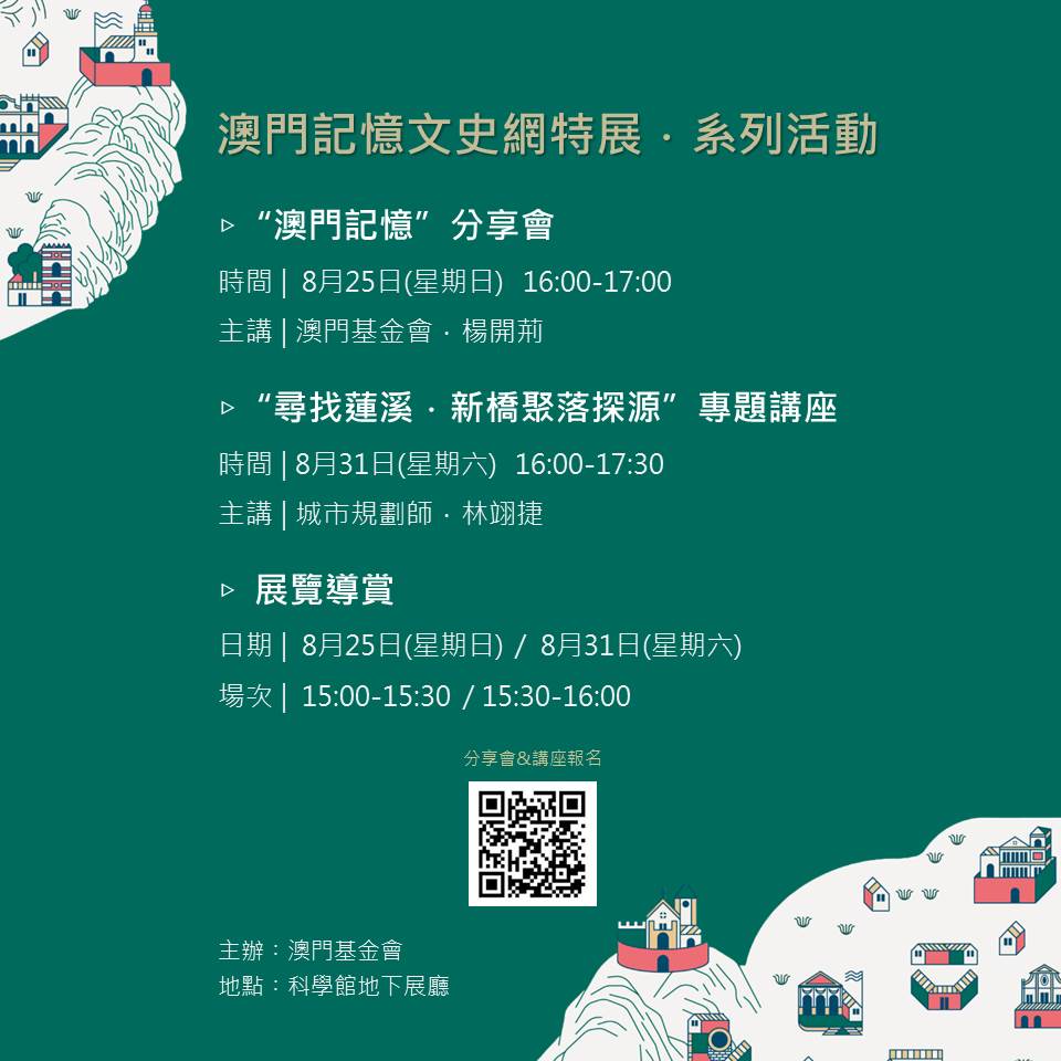 壓軸活動為第二場“澳門記憶”分享會及“尋找蓮溪.新橋聚落探源”專題講座,分別於8月25及31日下午4時於科學館舉行。分享會繼續由本會楊開荊主持;專題講座邀請了城市規劃師林翊捷主講,聚焦社區發展,探討蓮溪及新橋聚落的緣起與消失。活動名額有限,有興趣的市民可前往本會網站或“澳門記憶”文史網報名。同日下午3時及3時半,本會設有“澳門記憶.文史網特展”導賞活動,並有華夏小靈精與市民同樂,免費入場,歡迎大小朋友參加。查詢展覽及各項活動詳情,可於辦公時間內致電8797 8500或電郵macaumemory@fm.org.mo。