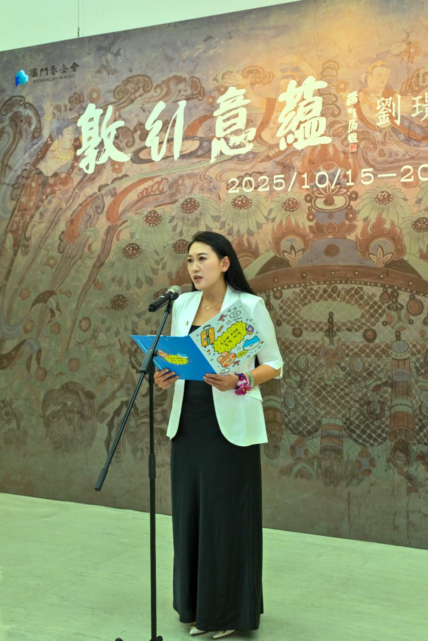 劉璟致詞表示,該展從構思到呈現,充滿奇妙的巧合,是偶然也是必然,既是對傳統藝術的虔誠致敬,也是對古代匠人精神的細緻揣摩,更是她嘗試以當代視角解讀敦煌藝術的一次探索,部分展品也是其在澳門求學期間的創作,展覽最終在澳門高度重視與無私幫助下得以在這片文化沃土上生根發芽。因此,這次展覽不僅是一次階段性的匯報,更是在澳門開啟的全新起點,具有特別意義。