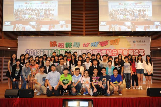 Com a organização da Fundação Macau e em colaboração com a Associação Geral de Estudantes Chong Wa de Macau, realizou-se o 1.º Acampamento de Verão em Inglês, integrado na Acção “ Sonho Realizado nas Férias - Acampamento de Verão para os Jovens de Macau” que teve lugar na Universidade de Estudos Estrangeiros de Guangdong, entre os dias 1 e 15 de Agosto. O Acampamento foi muito bem sucedido e no dia 2 de Setembro, pelas 6H30 da tarde, no Centro de Conferência do Centro de Ciência de Macau, a Fundação Macau organizou uma sessão de partilha seguida do jantar-convívio que contou com os estudantes que participaram no Acampamento e os seus pais. Entre os convidados de honra, estiveram presentes, nomeadamente, Zhong Rei, Chefe da Divisão da Cultura e Educação do Gabinete de Ligação do Governo Central Popular na RAEM, e os representantes das entidades de organização e colaboração, Au Weng Chi e Zhong Yi Seabra de Mascarenhas, membros do Conselho de Administração da Fundação, Lao Ka Chong e Lam Choi Sin, Director e Secretária Adjunta da Associação Geral de Estudantes Chong Wa de Macau.