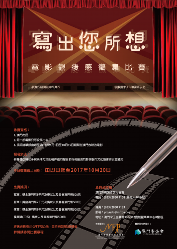 不同類型的電影可以帶給觀眾不同的感受,為了鼓勵澳門市民在欣賞電影的同時多思考或細心感受電影當中的細節,澳門影視製作文化協會現舉辦「寫出您所想‧電影觀後感」徵集比賽,希望通過比賽提供一個平台讓參賽者分享他們看完電影後的感受。通過參賽的作品,同時吸引其他市民對電影的興趣及關注,從而推動及培養電影欣賞的文化。