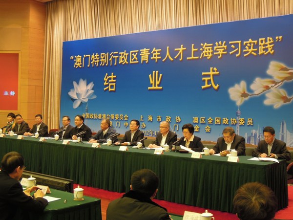 2012“澳門青年人才上海學習實踐計劃”昨日舉行結業式,全國政協副主席何厚鏵,上海市政協主席馮國勤,全國政協港澳台僑委員會副主任楊崇匯,中聯辦副主任徐澤,澳區全國政協常委、澳門基金會信託委員廖澤雲,澳區全國政協委員、澳門基金會監事長崔世昌,澳門基金會行政委員會主席吳志良等出席了儀式。何厚鏵寄語澳門的年青一代要有擔當意識,去迎接各種歷練,為推動澳門的可持續發展,為國家的現代化建設作出貢獻。主辦單位認同計劃取得圓滿成功,並期望28位學員能將上海的學習成果融滙到澳門中去,為澳門社會發展注入新動力。