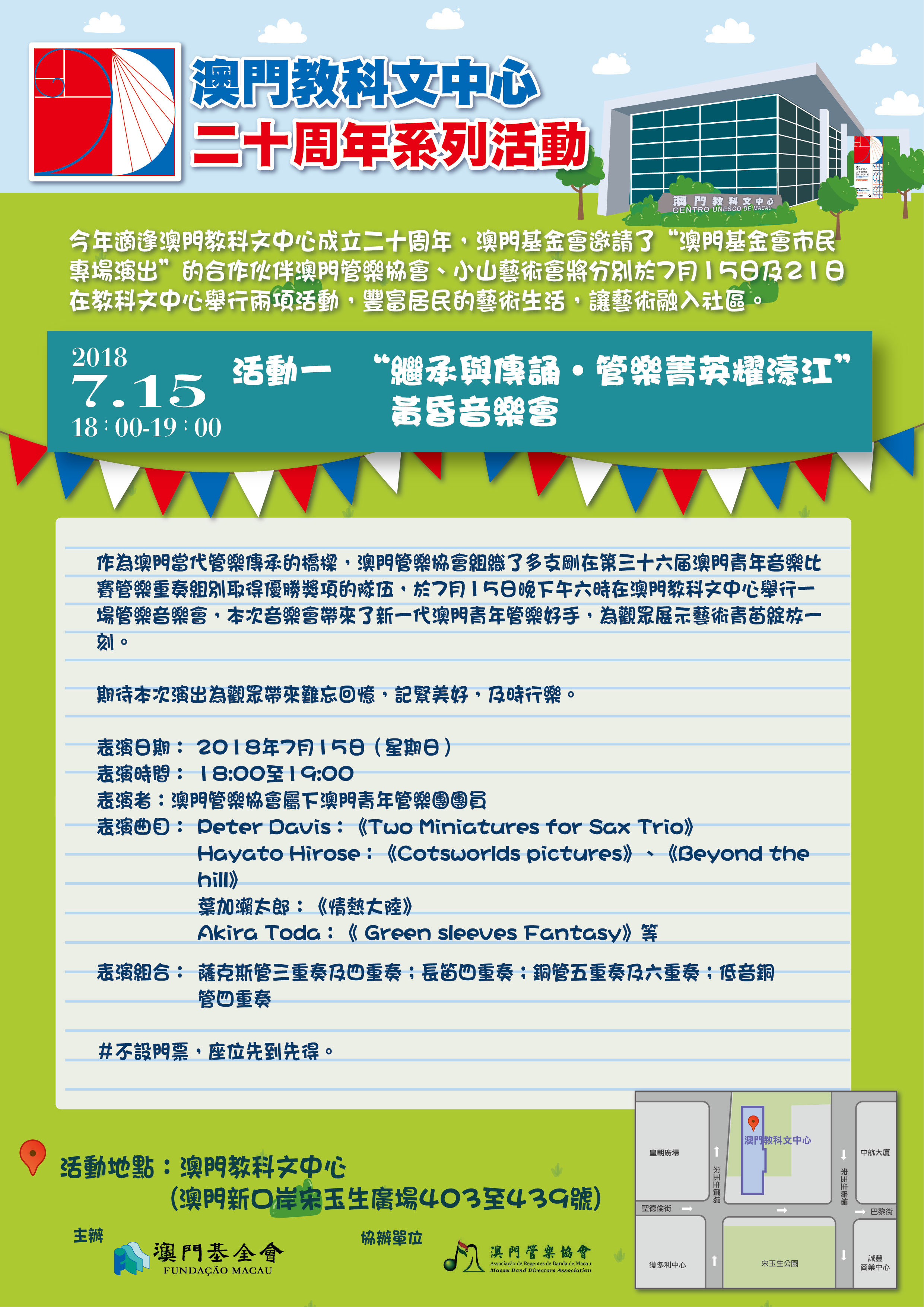 值澳門教科文中心二十周年,澳門基金會邀請了“澳門基金會市民專場演出”的合作伙伴澳門管樂協會、小山藝術會分別於7月15日及21日在澳門教科文中心舉行兩項活動,豐富居民的藝術生活,讓藝術融入社區。