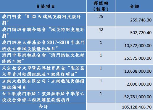 去年“天鴿”風災襲澳後,澳門基金會隨即於8月25日全力啟動“8.23 風災特別援助計劃”,務求對受災居民作出適切補助。有關計劃已結束,涉及經費逾5.8億元,當中各類補貼及援助金共4.75億元,其他支援項目共1.05億元。