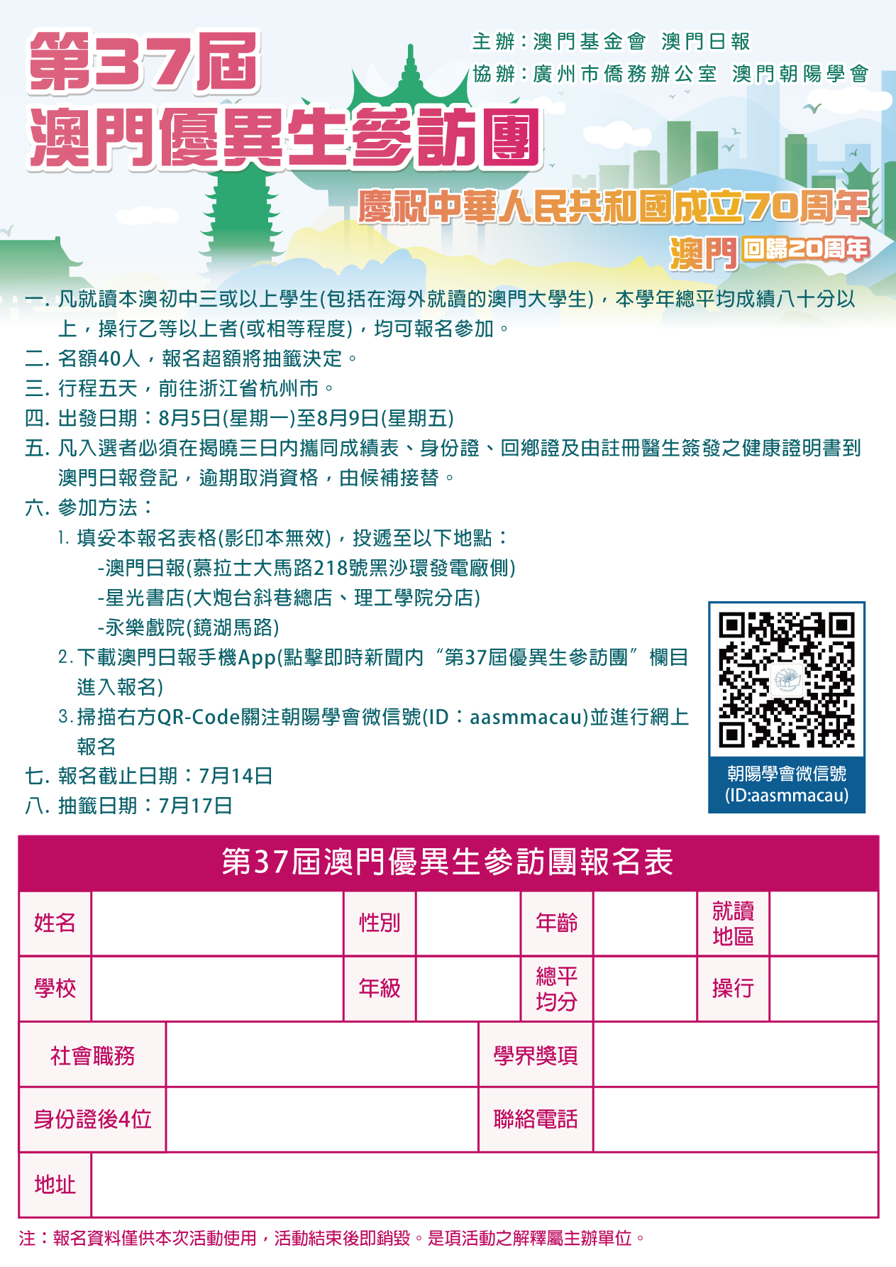 報名者可透過填妥報章報名表格(複印本無效),投遞至澳門日報(澳門慕拉士大馬路218號)、永樂戲院(鏡湖馬路85號E地下)、星光書店(大炮台斜巷總店和理工學院分店)。或透過網上報名,可掃描報名表上右方QR-Code關注朝陽學會微信號(ID:aasmmacau);或下載澳門日報手機版Apps(點擊即時新聞內“第三十七屆優異生參訪團”欄目進入報名)。