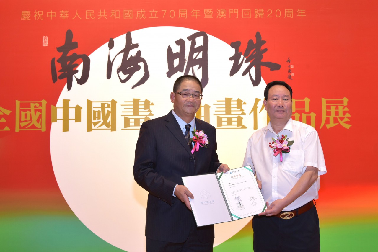 由澳門基金會、中國文學藝術基金會、珠海市文學藝術界聯合會主辦,中央人民政府駐澳門特別行政區聯絡辦公室宣傳文化部、澳門文化局、澳門藝術博物館支持,時代書畫報社、珠海市時代書畫院承辦,澳門廣府人(珠璣)聯誼會、神州媽祖文化交流協會等協辦的“慶祝中華人民共和國成立70周年暨澳門回歸20周年:南海明珠--全國中國畫、油畫作品展”已於本年十月二十九日(星期二)下午六時三十分在澳門回歸賀禮陳列館專題展覽廳開幕。