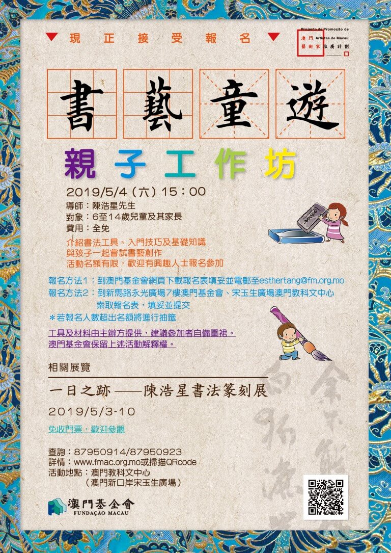 A Exposição de Caligrafia e Selos de Chan Hou Seng –“Vestígios de um Dia” integrada no Projecto de Promoção de Artistas de Macau, organizada pela Fundação Macau (FM), vai inaugurar-se no dia 7 de Maio de 2019 (3ª-feira), na Sala de Exposições do Centro UNESCO de Macau. Em coordenação com esta exposição, a Fundação Macau realizará o Workshop “Arte de caligrafia e jogos de crianças para pais e filhos”, no Centro UNESCO de Macau, e o autor da exposição é Chan Hou Seng, que será o monitor deste workshop.