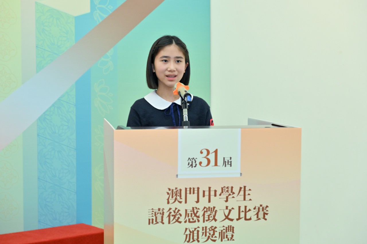 初中組冠軍得主培正中學的江艾霖同學發表感言稱,詩詞是澳門珍貴的文化遺產。澳門的魅力從來不止於現代的繁華,更深藏在被歲月洗練過的詩篇裡。並表示我們是讀者,更是傳承者,讓我們繼續用文字記錄澳門這座充滿詩意的城市,書寫屬於這座城市的新故事。