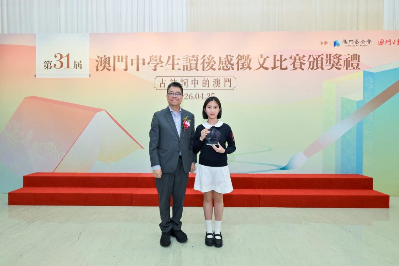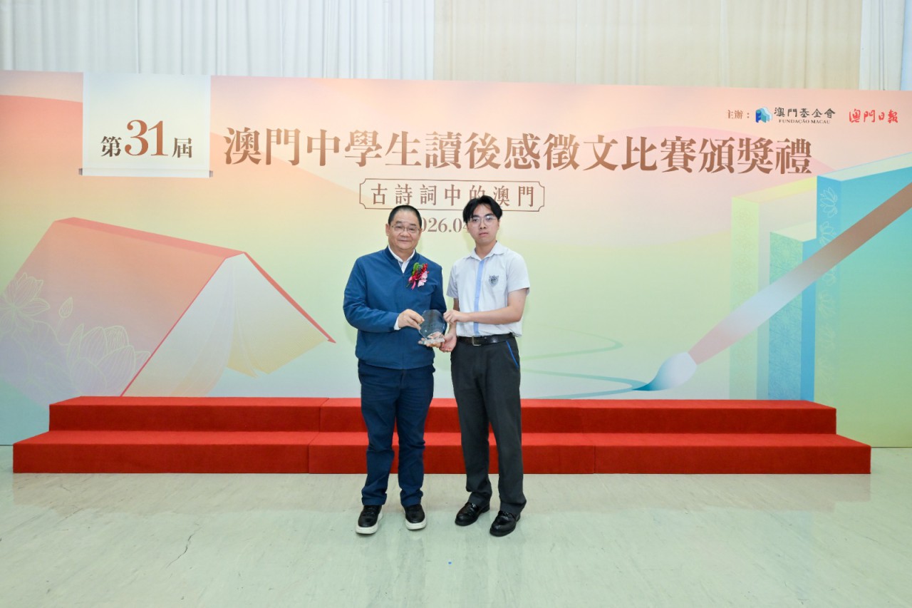 由澳門基金會與澳門日報合辦的第三十一屆“澳門中學生讀後感徵文比賽”反應熱烈,本屆以“古詩詞中的澳門”為主題,共收到27間學校439份參賽作品。頒獎禮已於2026年4月25日在澳門教科文中心舉行,主辦單位向二十位獲獎學生頒發獎座,以示鼓勵。澳門基金會行政委員會主席吳志良,澳門日報總編輯崔志濤,高中組評判谷雨、陸奧雷,初中組評判譚健鍬、林格,以及各校校長、老師、獲奬同學及其家長出席典禮,場面熱鬧。