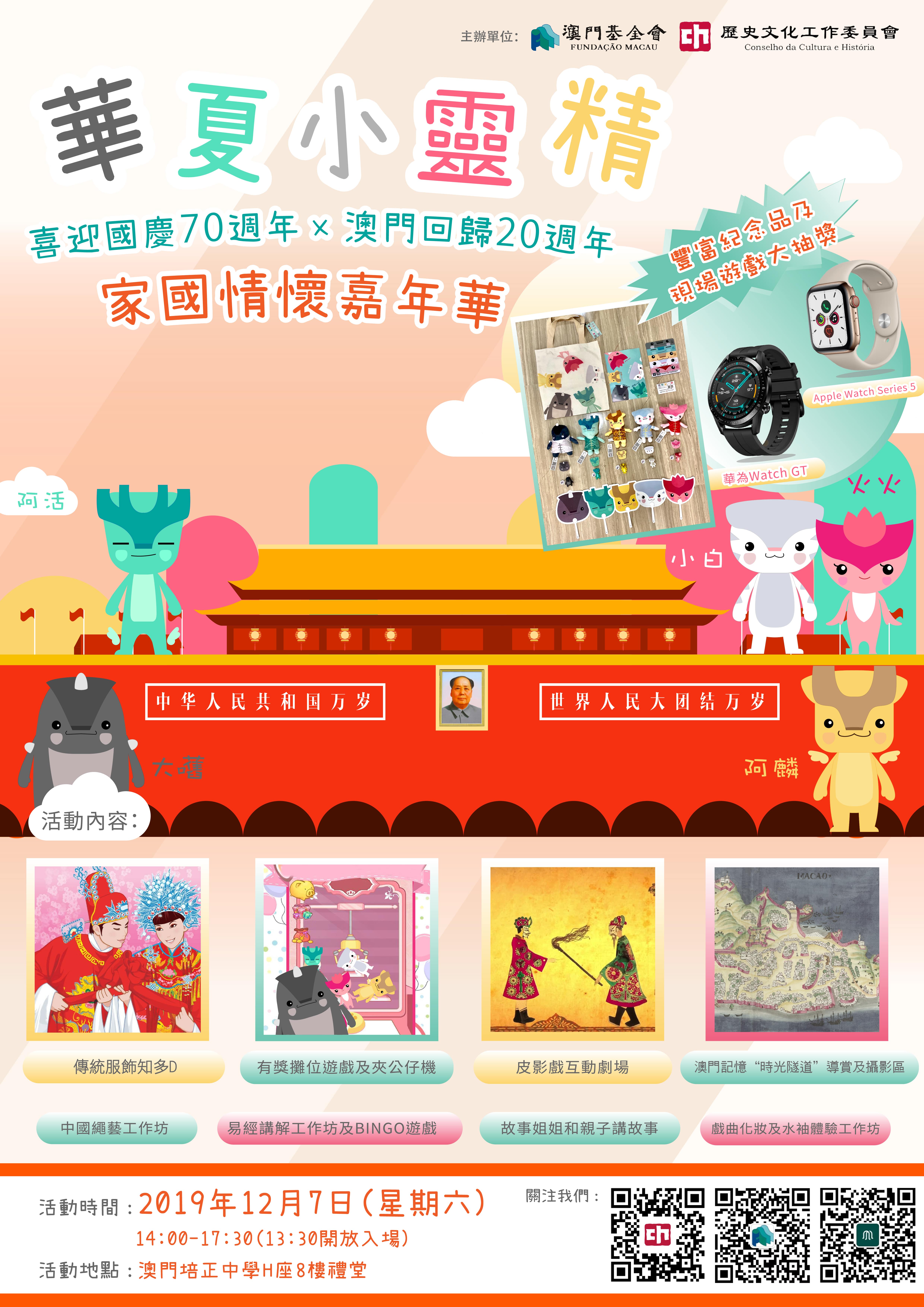 為慶祝中華人民共和國成立70周年暨澳門回歸祖國20周年,促進市民對中華及本土歷史文化的認識,澳門基金會及其歷史文化工作委員會將於下周六(12月7日)下午2:00-5:30於培正中學舉辦“喜迎國慶70週年 X 回歸20週年─華夏小靈精家國情懷嘉年華”,透過攤位遊戲、工作坊、展示等形式,靈活生動地介紹中華文化及雙慶相關主題內容,加深市民對祖國和澳門的認識。