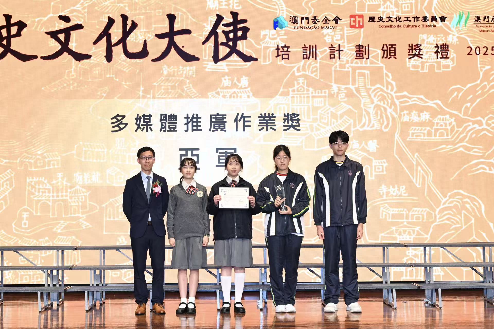 在儀式上,嘉賓分別向5班學員頒授培訓計劃證書、並頒授優秀報告證書及學生組多媒體推廣作業比賽的冠、亞、季軍的獎項,其中多媒體推廣作業冠軍由嘉諾撒聖心英文中學奪得,亞軍得主為澳門大學附屬應用學校及濠江中學組成的隊伍,而季軍則由澳門坊眾學校及氹仔坊眾學校組成的隊伍奪得。 新一期“歷史文化大使培訓計劃”和更多歷史文化推廣活動將陸續開展,有興趣的市民和學生請密切留意本會網站。如有查詢,請聯絡澳門基金會活動處吳亦亨先生(8795 8565)。
