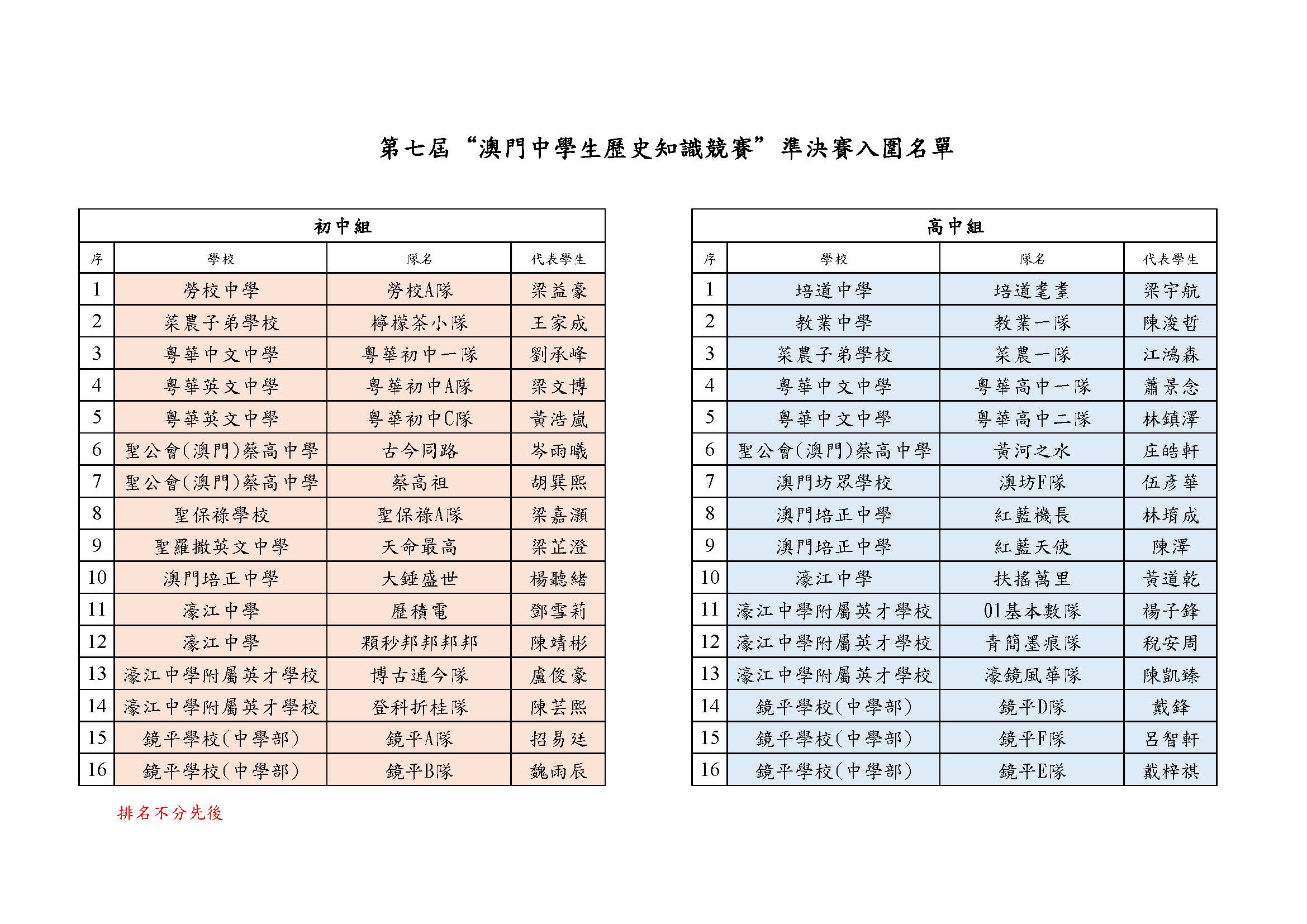 第七屆“澳門中學生歷史知識競賽”準決賽隊伍名單揭曉