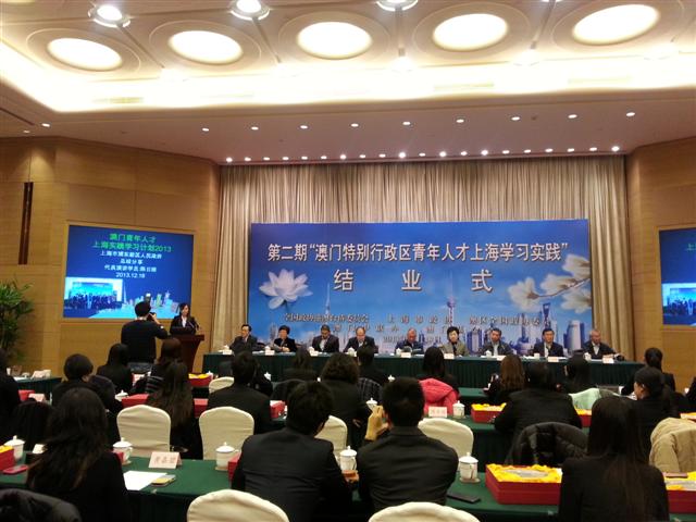 A Cerimónia de Encerramento do “Projecto de Estágio dos Jovens de Macau em Xangai 2013” teve lugar no passado dia 18 de Dezembro, às 10H00, na sede do Comité da Conferência Consultiva Política do Povo Chinês do Município de Xangai, e foi presidida pelas seguintes individualidades: o Vice-Presidente do Comité Nacional da Conferência Consultiva Política do Povo Chinês, Ho Hau Wah, o Vice-Presidente do Comité da Conferência Consultiva Política do Povo Chinês do Município de Xangai, Jiang Liang, o Subdirector do Comité para os ultramarinos de Hong Kong, Macau e Taiwan da Conferência Consultiva Política do Povo Chinês, Hua Jian, Vice-Chefe do Departamento de Colaboração do Gabinete de Ligação do Governo Central da RPC na RAEM, Xu Shuang, o Presidente, o Vice- Presidente e o membro do Conselho de Administração da Fundação Macau, Wu Zhiliang, Lam Kam Seng Peter e Lai Chan Keong, respectivamente. As entidades organizadoras disseram “vir a esperar que os estagiários possam fazer uma reflexão sobre as experiências obtidas em Xangai, de modo a contribuir para a construção da RAEM”.